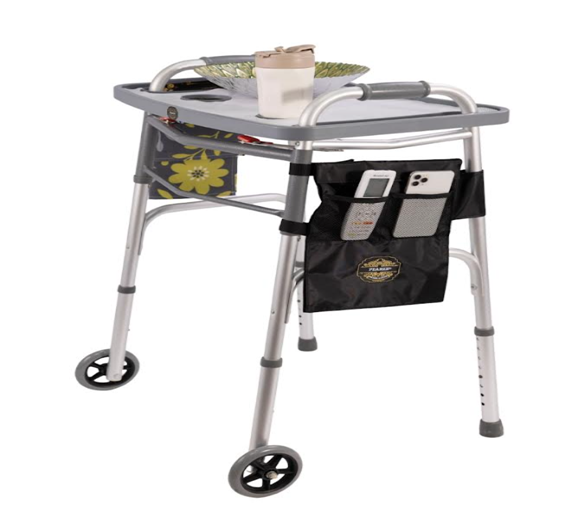 A tray attachment provides a flat, stable surface that moves along with the walker. Instead of trying to carry items in one hand, users can safely place them on the tray while keeping both hands firmly on the walker handles.